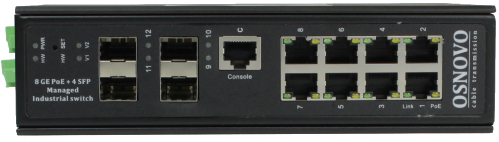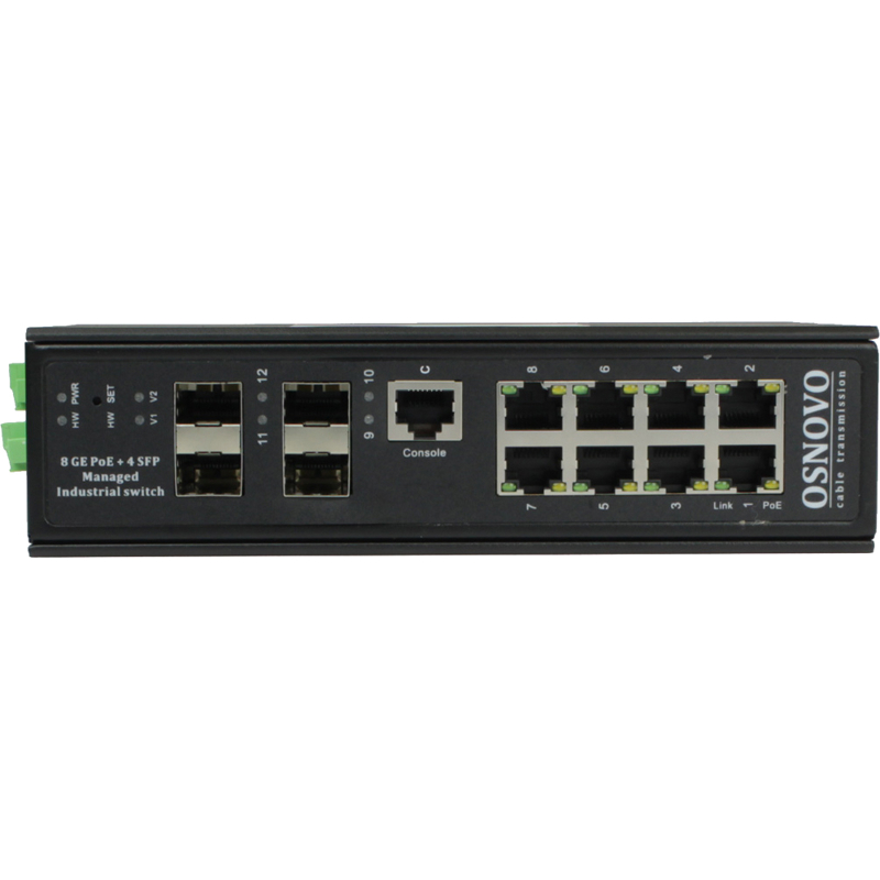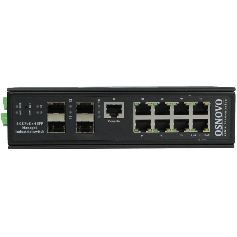 Промышленный управляемый (L2+) HiPoE коммутатор Gigabit Ethernet на 8GE PoE + 4 GE SFP порта с функцией мониторинга температуры/ влажности/ напряжения. Порты: 1 x GE (10/100/1000Base-T) с PoE BT (до 90W) + 7 x GE (10/100/1000Base-T) с PoE (до 30W) + 4 x GE SFP (1000Base-X). Уровень управления L2+. Соответствует стандартам PoE IEEE 802.3af/at/bt. Автоматическое определение и режим антизависания PoE устройств. управление питанием. Суммарная мощность PoE до 300W. Поддержка режима CCTV: Увеличение расстояния передачи данных и питания до 250м. Встроенная система мониторинга температуры/ напряжения + внешний датчик температуры/ влажности. Поддержка ПО OSNOVO Monitoring System. Выходы типа "Сухой контакт", Цифровой вход. Встроенная грозозащита 6кВ, электростатическая защита 8кВ. Питание: 2 x входа DC37-57V(315W). БП в комплект НЕ входит. Монтаж на DIN-рейку или на стену (крепление в комплекте). Размеры (ШхВхГ): 50х187х130мм. Вес: 1,3кг. Рабочая температура: -40…+80°С.